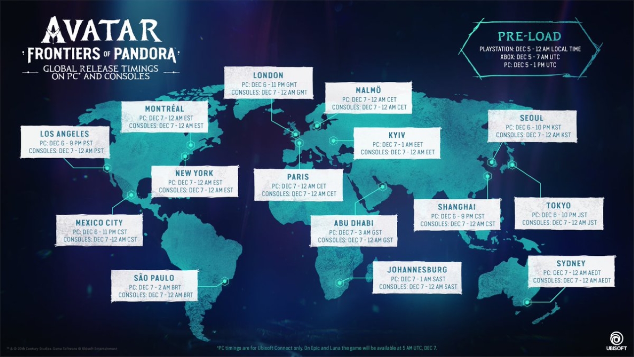 Avatar: Frontiers of Pandora launches globally on December 6 at 9pm PST for PC players. However, for console owners it is releasing on December 7 at 12am local time. It should be noted that players that have pre-ordered a copy of Avatar: Frontiers of Pandora will still have to opportunity to pre-load the game, this will allow you to jump into Pandora’s world the moment it becomes available. If you’re unsure on how to pre-load Avatar: Frontiers of Pandora, you can check out our guide here. Otherwise, for more articles and guides just like this one, be sure to check out our Games Hub.