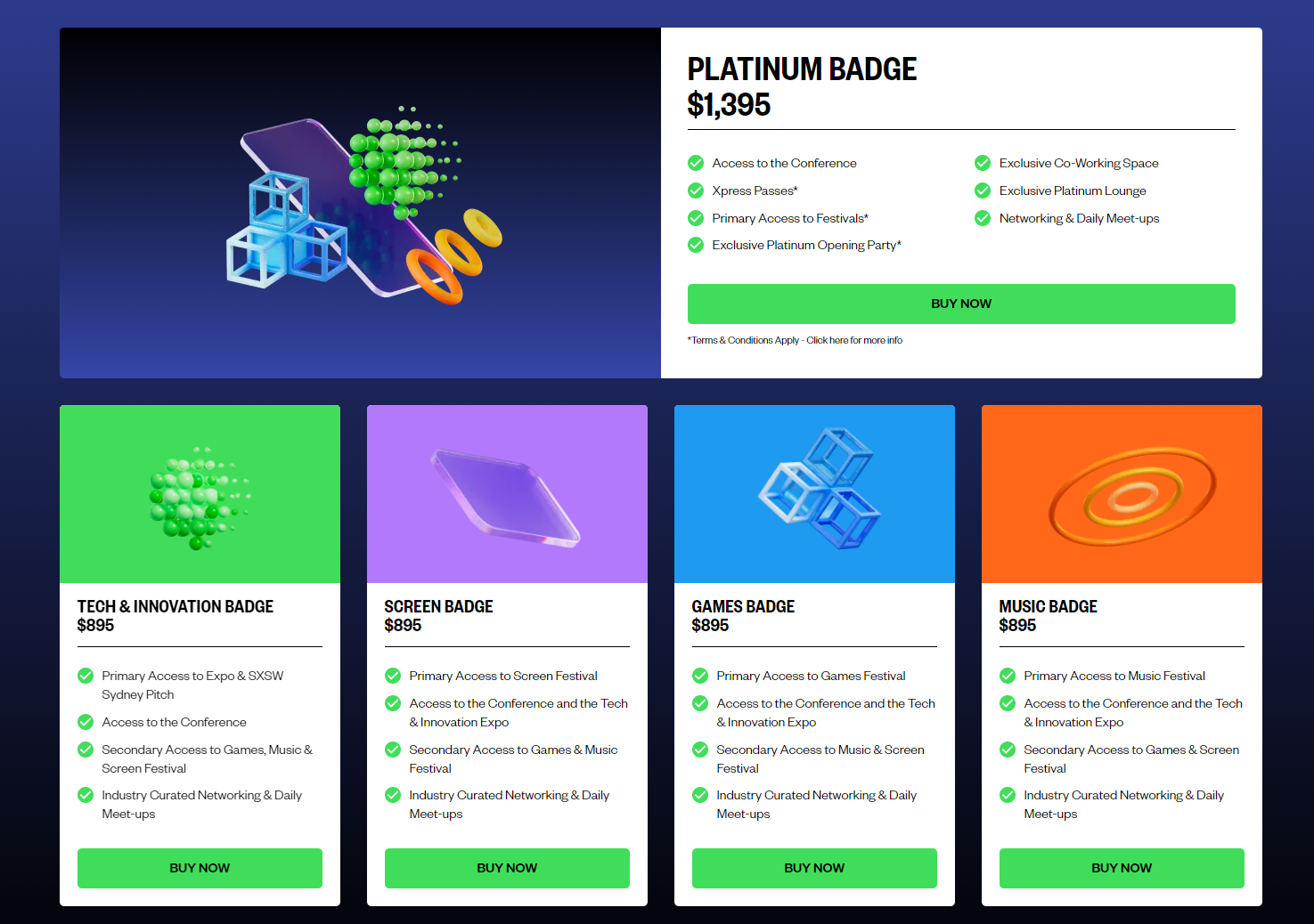 At SXSW Sydney, 5 different types of badges are available: Platinum, Tech & Innovation, Screen, Music, and Games. Below, you can view what you can expect from each badge. However, it’s important to note that badges are designed for members of the industry, and wristbands will be available closer to the event.