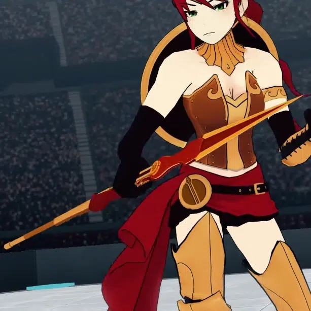Miló and Akoúo̱ (literally ‘speak’ and ‘listen’ in Greek) are Pyrrha’s weapons of choice in RWBY: a simple shield and a javelin which doubles as not only a rifle but also a xiphos – a Greek, dual-bladed short sword.